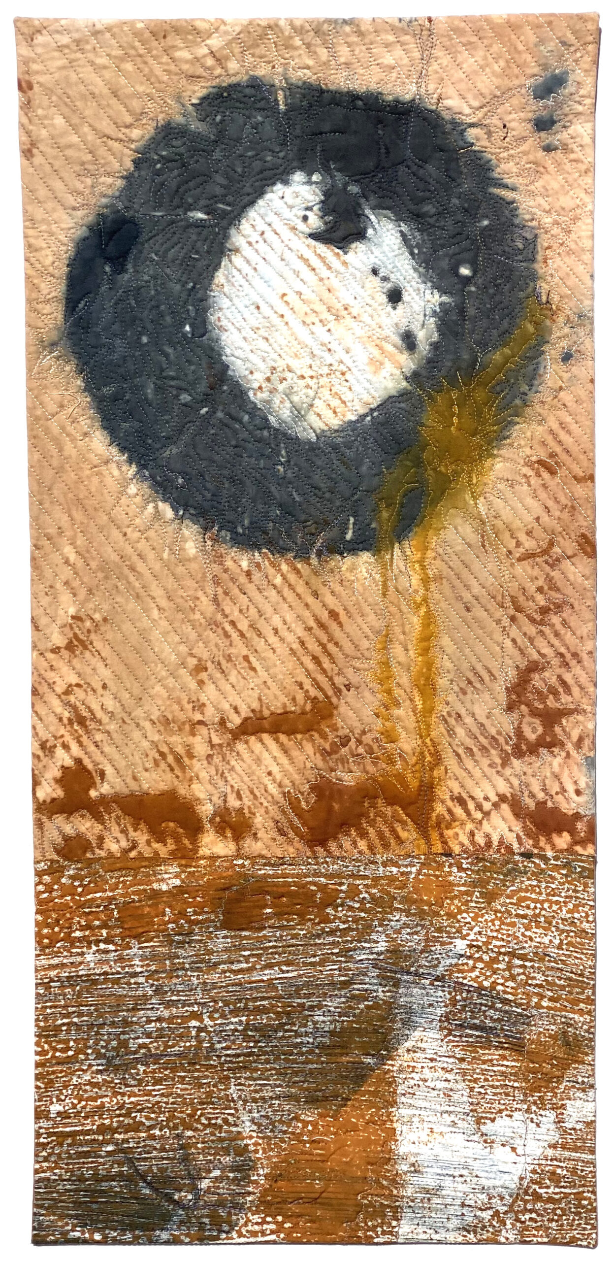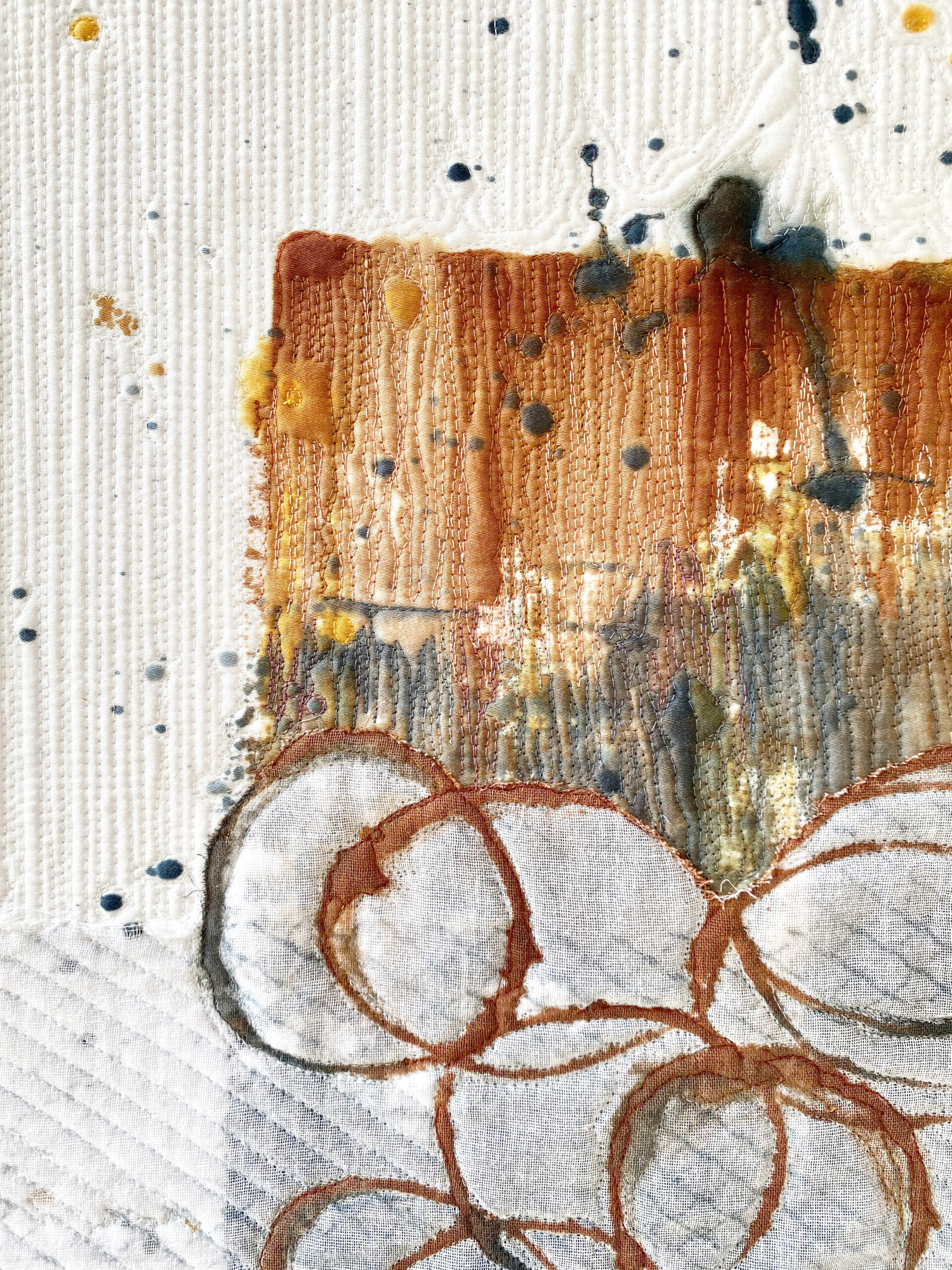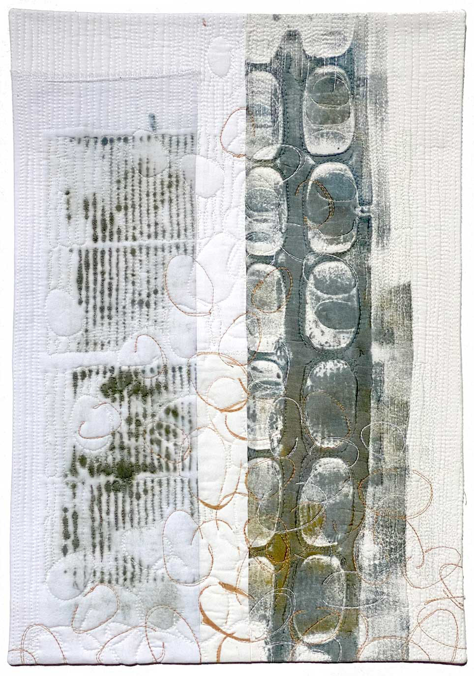 I love combining monoprinting with other dye methods to construct complex cloth. Second and third printings add visual layers of complexity that mimic the processes at work on the subject matter. Collaging fabrics and adding line and texture with sewing, I create pieces that continue to interact with their environment: raw edges, hanging threads, shadows.